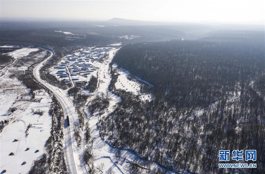“送水小火車(chē)”行駛在林海間,前往送水地點(diǎn)(1月17日攝,無(wú)人機(jī)照片)。新華社記者許暢攝