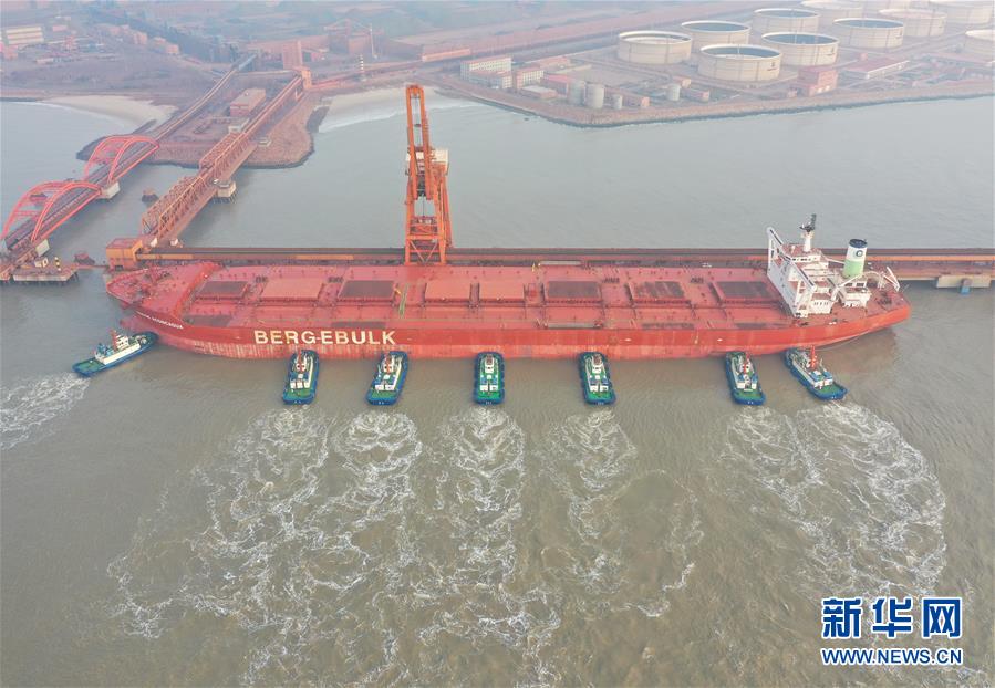 2月24日,一艘40萬噸級輪船在拖輪的協(xié)助下向曹妃甸港區(qū)礦石碼頭靠泊(無人機照片)。 連日來,河北省唐山港曹妃甸港區(qū)為有效防控疫情、保證安全生產(chǎn),采取對進入港區(qū)人員檢測體溫、對車輛進行消殺等嚴格措施,為海、陸交通暢通和物資運輸提供保障。 新華社記者 楊世堯 攝