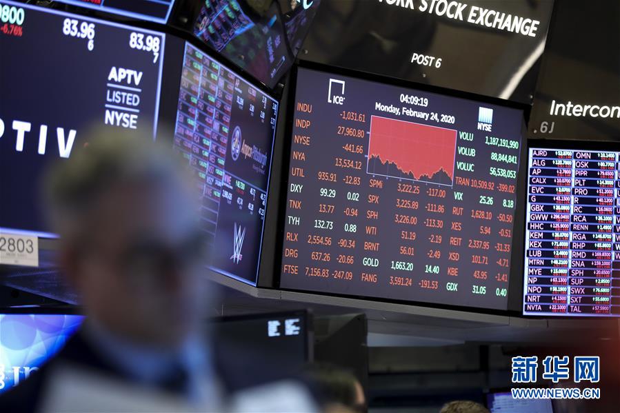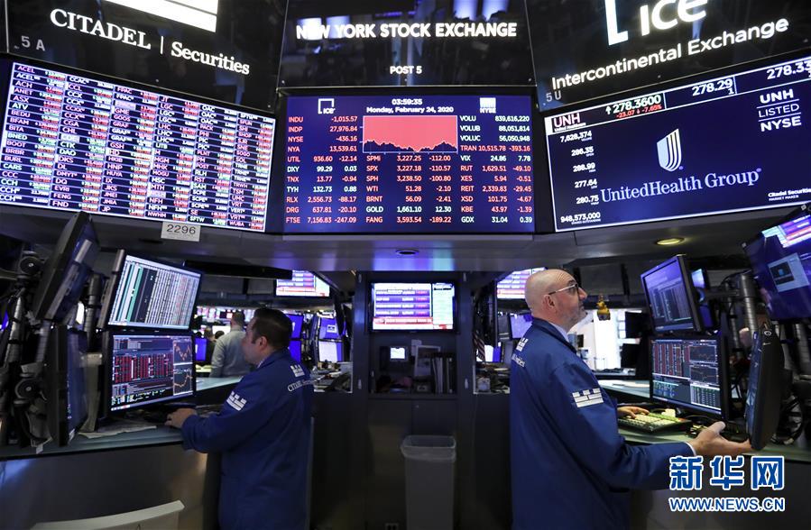 2月24日,美國(guó)紐約證券交易所的電子屏顯示當(dāng)天收盤情況。新華社記者 王迎 攝