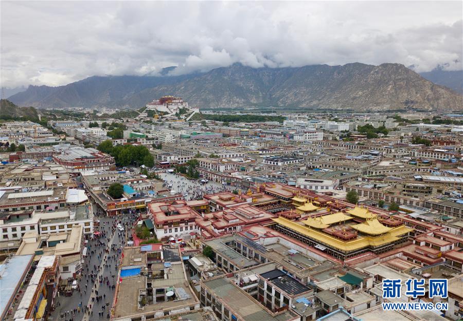 8月10日無(wú)人機(jī)拍攝的大昭寺和遠(yuǎn)處的布達(dá)拉宮。新華社記者侯東濤攝
