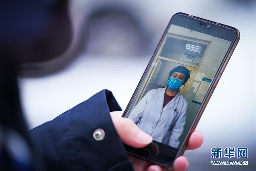 李可心展示手機(jī)里母親王晶的工作照(3月1日攝)。母親王晶是一名醫(yī)生,疫情期間在留觀病房工作。 新華社記者王松攝