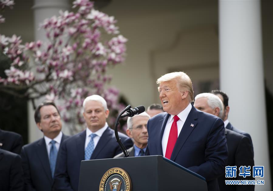 3月13日,美國總統(tǒng)特朗普(中)在華盛頓白宮的記者會上講話。特朗普當天下午在白宮發(fā)表講話時正式宣布“國家緊急狀態(tài)”。他說,此舉旨在讓美國聯(lián)邦政府全力投入到抗擊新冠肺炎疫情的努力中。這項舉措將釋放500億美元資金,幫助各州和地方政府應對疫情。新華社記者劉杰攝