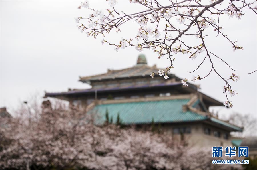 近日,隨著氣溫上升,武漢大學(xué)圖書館附近一片櫻花開放。新華社記者費茂華攝