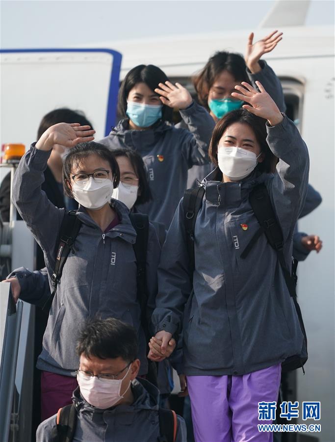 3月17日,在江蘇南京祿口國(guó)際機(jī)場(chǎng),醫(yī)療隊(duì)隊(duì)員向前來(lái)接機(jī)的人們揮手致意。新華社記者季春鵬攝