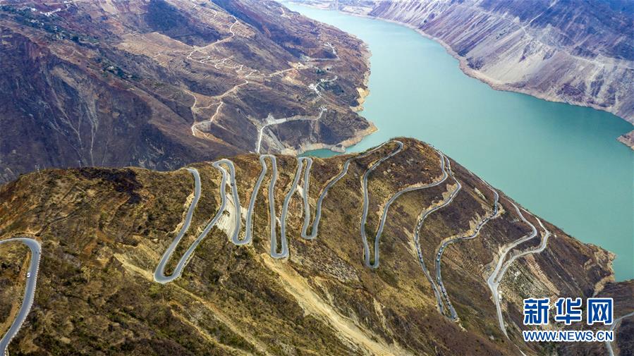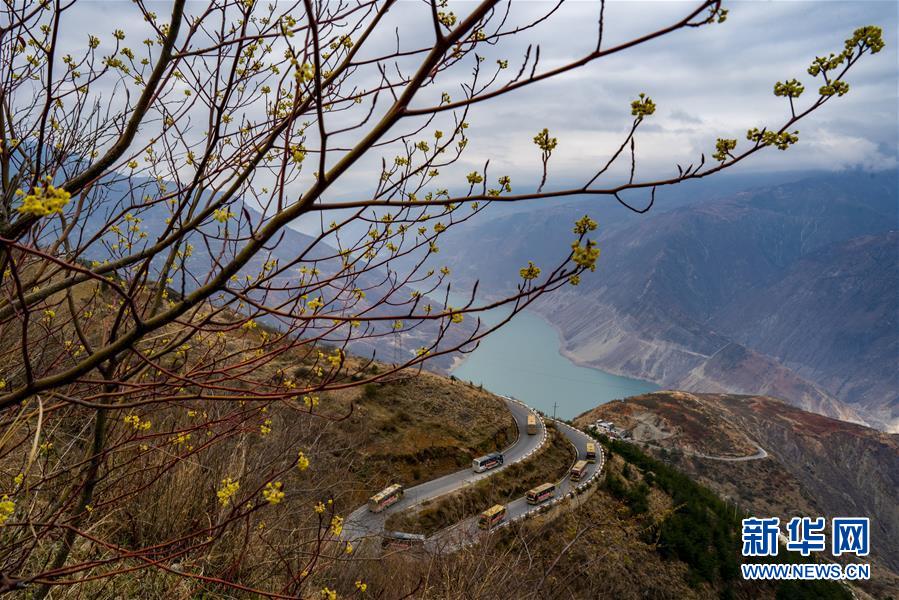搬家的車(chē)隊(duì)行駛在金沙江畔的盤(pán)山公路上,江對(duì)岸是四川省金陽(yáng)縣(3月15日攝)。 新華社記者 江文耀 攝