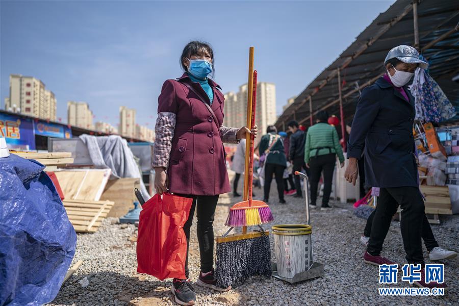 王大香和丈夫晏付高在新家鋪床(3月15日攝)。 新華社記者 江文耀 攝