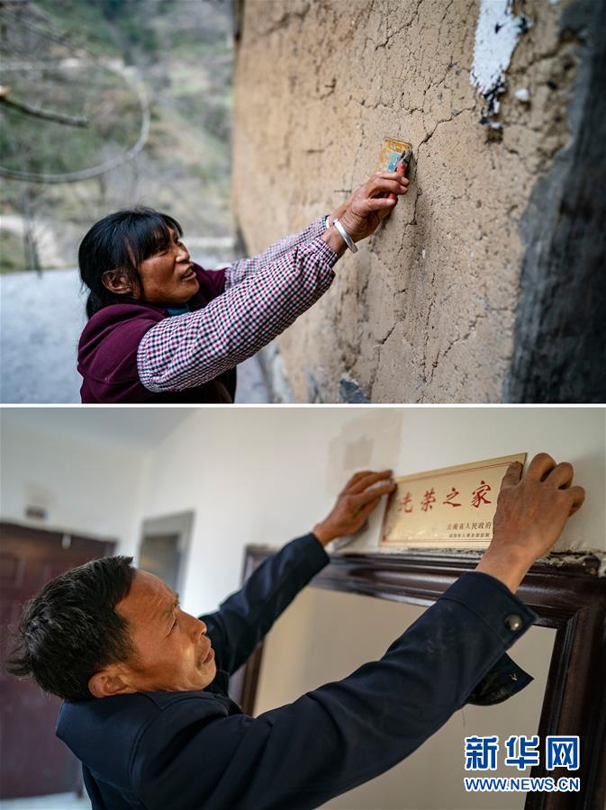 這是一張拼版照片:上圖為云南省永善縣大興鎮(zhèn)駱丘村村民王大香拆下老屋的門(mén)牌留作紀(jì)念(3月14日攝);下圖是作為現(xiàn)役軍人家屬的晏付高把“光榮之家”的牌匾掛在新家的門(mén)上(3月15日攝)。 新華社記者 江文耀 攝