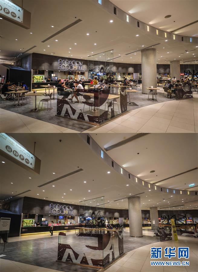 這是3月21日拍攝的泰國曼谷暹羅百麗宮商場(chǎng)負(fù)一層的美食城(上圖)和3月22日拍攝的美食城對(duì)比圖。商場(chǎng)除了負(fù)一層的美食城和超市外,全部關(guān)閉。美食城只對(duì)顧客提供外賣服務(wù)。新華社記者張可任攝