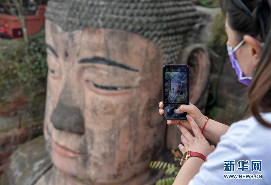 3月23日,一位游客在樂山大佛景區(qū)內用手機拍攝。新華社記者張超群攝