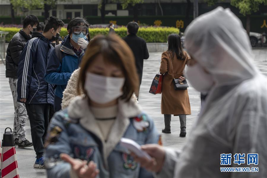 3月30日,在武商國(guó)際廣場(chǎng)的超市門口,工作人員在測(cè)量顧客的體溫。當(dāng)日,武漢市多家商場(chǎng)開門迎客。新華社記者費(fèi)茂華攝