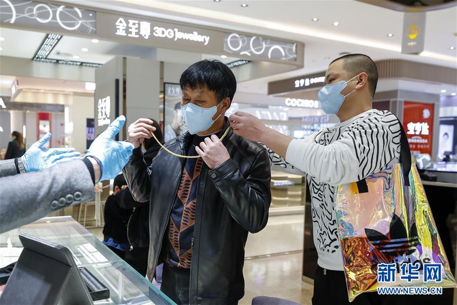 3月30日,在武漢市武商世貿廣場,顧客(右二)在挑選飾品。當日,武漢市多家商場開門迎客。新華社記者沈伯韓攝