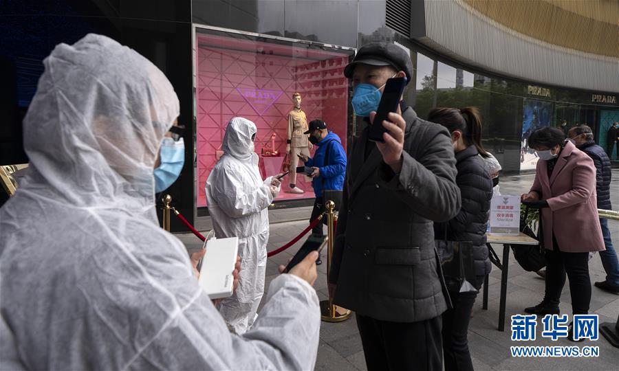 3月30日,在武商國際廣場(chǎng)的超市門口,顧客向工作人員出示健康碼。當(dāng)日,武漢市多家商場(chǎng)開門迎客。新華社記者費(fèi)茂華攝