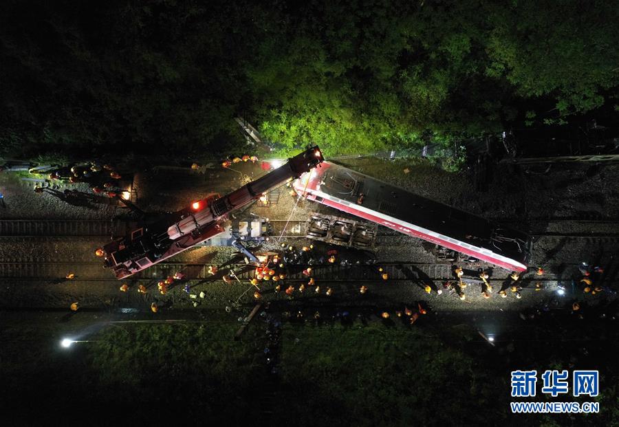 3月30日晚,工程機械在京廣鐵路郴州段脫軌事故現(xiàn)場作業(yè)(無人機照片)。新華社記者李尕攝