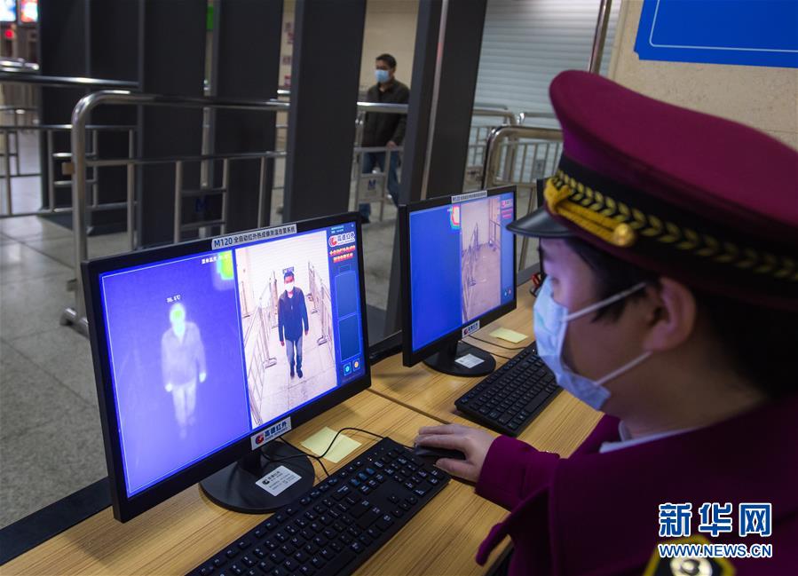 3月23日,在漢口火車站地鐵站,工作人員在測試測溫系統(tǒng)。該車站的2個(gè)入口處,已經(jīng)安裝了電子測溫儀器,只要有乘客通過,就會在電腦顯示屏上出現(xiàn)體溫的數(shù)據(jù),監(jiān)控進(jìn)站乘客體溫。新華社記者肖藝九攝