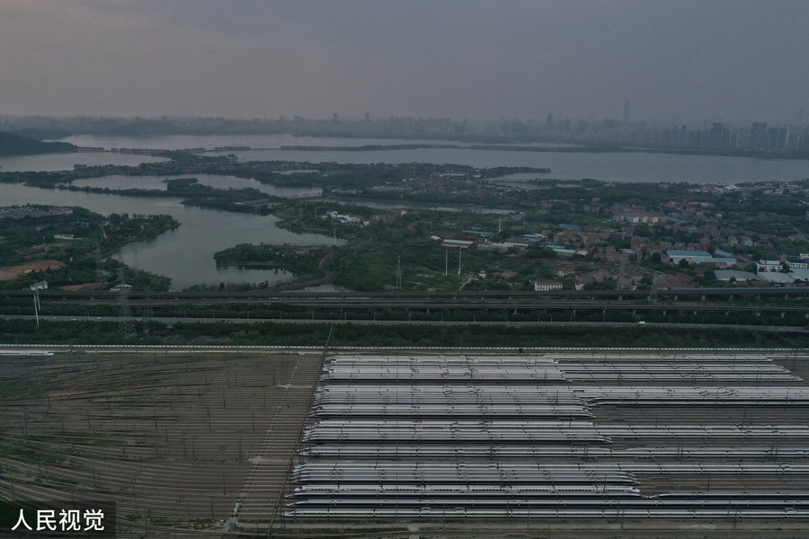 2020年4月6日,武漢動(dòng)車(chē)段高鐵動(dòng)車(chē)組整裝待發(fā)(無(wú)人機(jī)照片)。