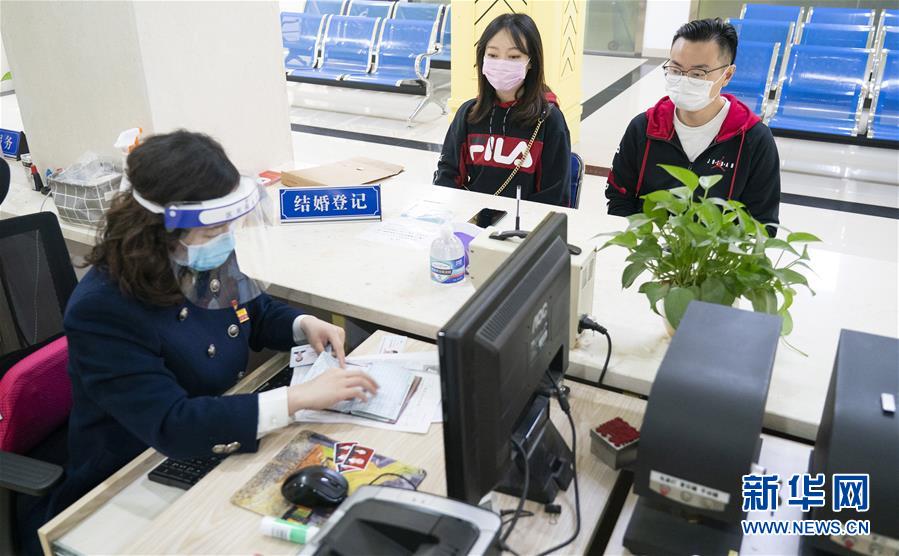 4月7日,在武漢市江岸區(qū)民政局婚姻登記處,工作人員為新人陳先生與張女士辦理結(jié)婚登記手續(xù)。 新華社記者才揚(yáng)攝