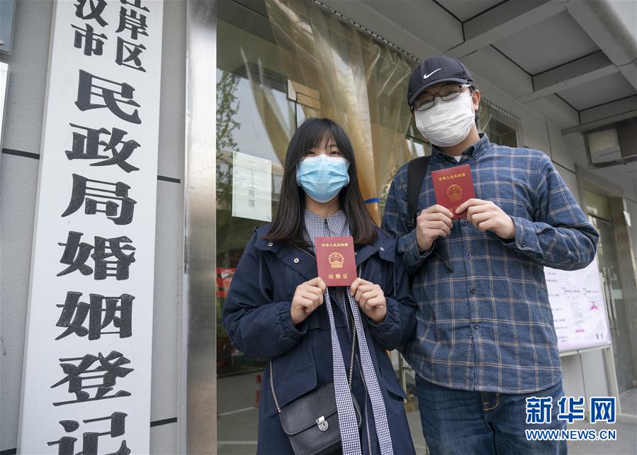 4月7日,在武漢市江岸區(qū)民政局婚姻登記處,新人盧先生和丁女士展示結(jié)婚證。 新華社記者才揚(yáng)攝