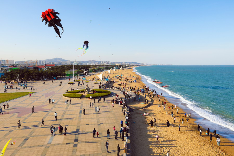 2020年4月5日,在山東日照萬平口景區(qū),游客放飛五彩斑斕的風(fēng)箏。