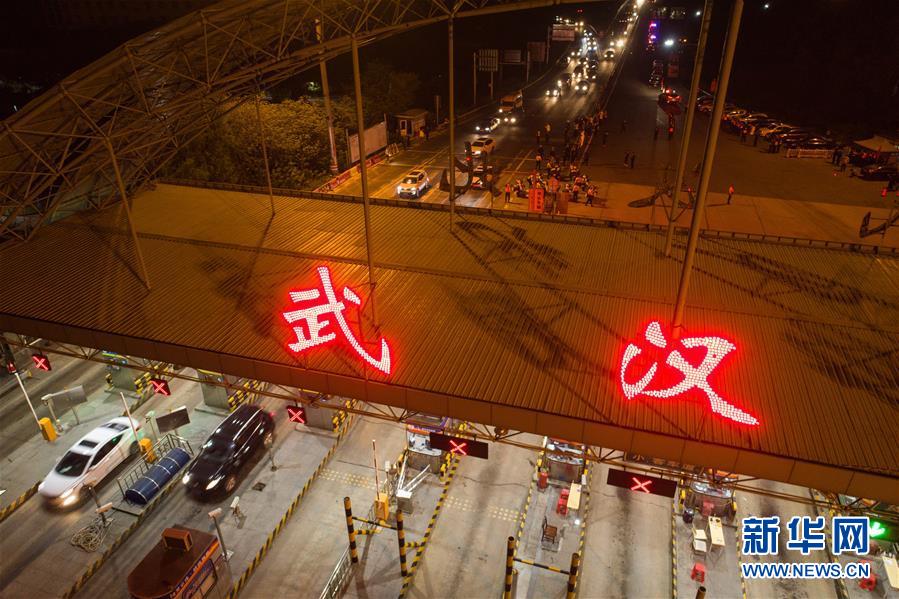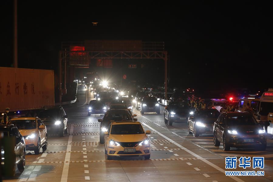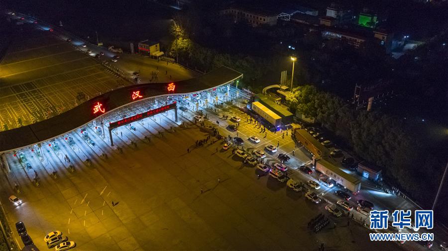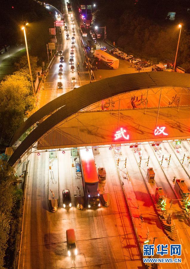 4月8日凌晨,車輛通過武漢北高速收費(fèi)站(無人機(jī)照片)。 新華社記者 肖藝九 攝