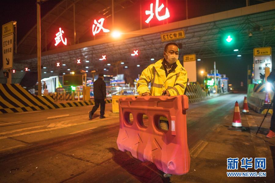 4月8日凌晨,在武漢北高速收費(fèi)站,工作人員移除圍欄。 新華社記者 肖藝九 攝