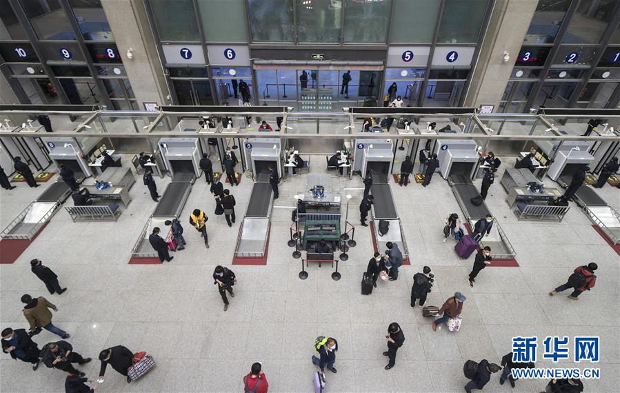 4月7日晚,旅客接受安檢后進(jìn)入武昌火車站。 新華社記者 費(fèi)茂華 攝