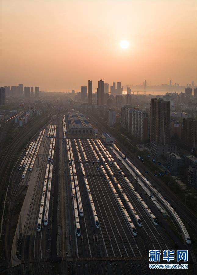 4月8日,在武漢動車段,列車??吭诖孳嚲€上準(zhǔn)備投入運(yùn)行(無人機(jī)照片)。當(dāng)日,武漢市正式解除離漢離鄂通道管控措施,幾十組在武漢動車段經(jīng)過檢修消殺的動車組,猶如“陸地艦隊(duì)”停靠在存車線上,蓄勢待發(fā),重新啟程。 新華社記者 肖藝九 攝