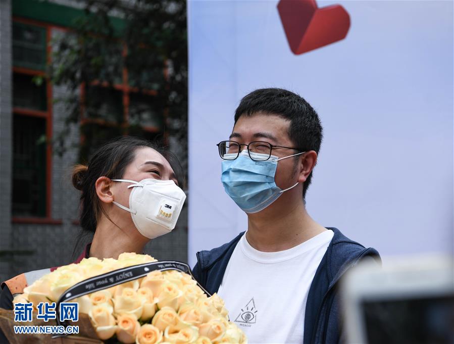4月21日,在四川大學(xué)華西醫(yī)院,醫(yī)療隊(duì)隊(duì)員接受男友的捧花。當(dāng)日,來自四川大學(xué)華西醫(yī)院、華西第二醫(yī)院、華西第四醫(yī)院的醫(yī)療隊(duì)隊(duì)員解除隔離休整,與分別許久的家人、同事團(tuán)聚,緊緊相擁。新華社記者王曦?cái)z