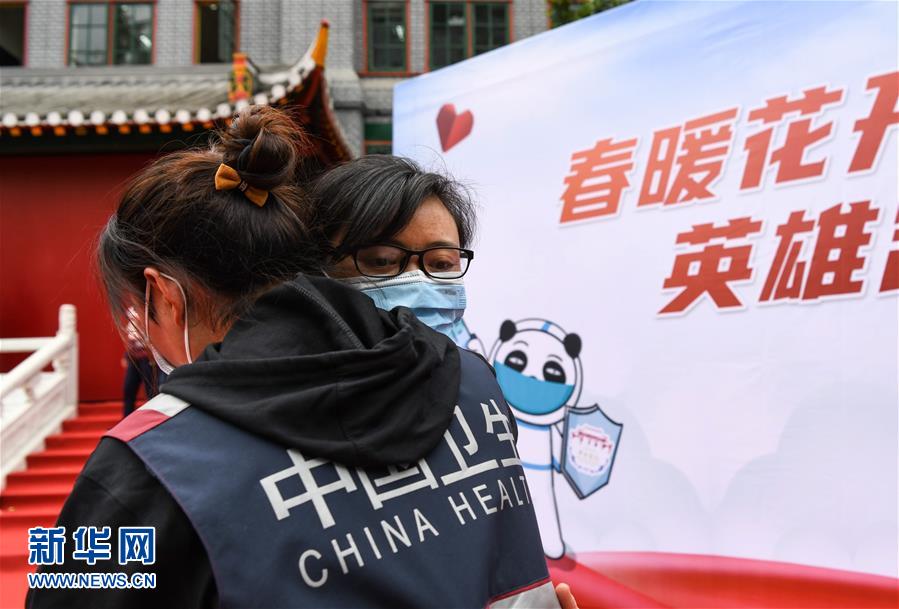 4月21日,在四川大學(xué)華西醫(yī)院,醫(yī)療隊(duì)隊(duì)員和同事相互擁抱。當(dāng)日,來自四川大學(xué)華西醫(yī)院、華西第二醫(yī)院、華西第四醫(yī)院的醫(yī)療隊(duì)隊(duì)員解除隔離休整,與分別許久的家人、同事團(tuán)聚,緊緊相擁。新華社記者王曦?cái)z