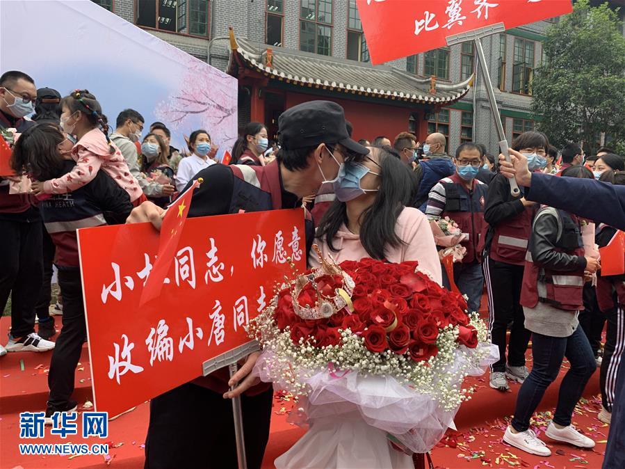 4月21日,在四川大學(xué)華西醫(yī)院,醫(yī)療隊(duì)隊(duì)員向女友現(xiàn)場求婚。當(dāng)日,來自四川大學(xué)華西醫(yī)院、華西第二醫(yī)院、華西第四醫(yī)院的醫(yī)療隊(duì)隊(duì)員解除隔離休整,與分別許久的家人、同事團(tuán)聚,緊緊相擁。新華社記者盧宥伊攝