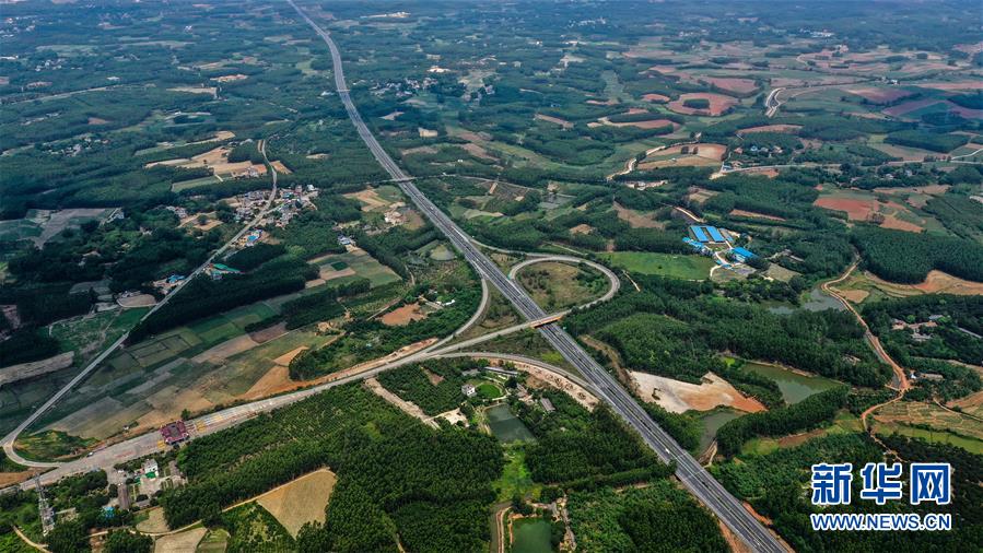 這是4月21日拍攝的合浦縣境內(nèi)的桂海高速公路(無人機(jī)照片)。暮春時節(jié),從空中俯瞰廣西北海市合浦縣大地,河流、稻田、蝦塘、道路、村莊星羅棋布、色彩斑斕,美不勝收。新華社記者張愛林?jǐn)z