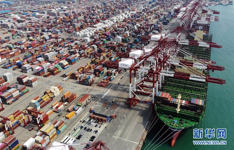 “現(xiàn)代商船阿爾赫西拉斯”輪靠泊在青島港前灣碼頭(無人機(jī)照片,4月26日攝)。當(dāng)日,載箱量可達(dá)2.4萬標(biāo)準(zhǔn)箱的世界最大集裝箱船“現(xiàn)代商船阿爾赫西拉斯”輪從山東青島港開啟首航,這條船的甲板面積超過2.4萬平方米,相當(dāng)于3.5個標(biāo)準(zhǔn)足球場大小。新華社記者李紫恒攝