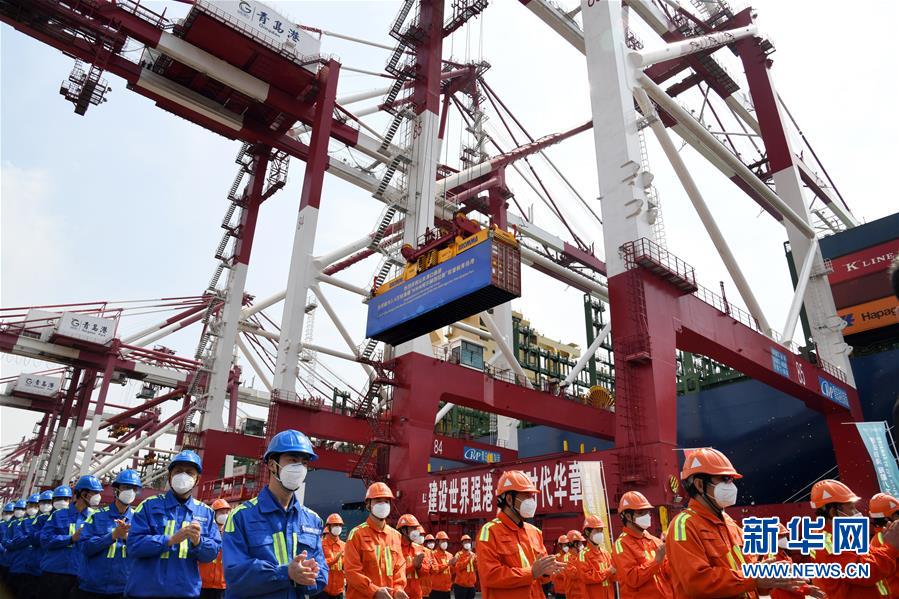 4月26日,在青島港前灣碼頭,碼頭工人參加“現(xiàn)代商船阿爾赫西拉斯”輪首航儀式。當(dāng)日,載箱量可達(dá)2.4萬標(biāo)準(zhǔn)箱的世界最大集裝箱船“現(xiàn)代商船阿爾赫西拉斯”輪從山東青島港開啟首航,這條船的甲板面積超過2.4萬平方米,相當(dāng)于3.5個標(biāo)準(zhǔn)足球場大小。新華社記者李紫恒攝