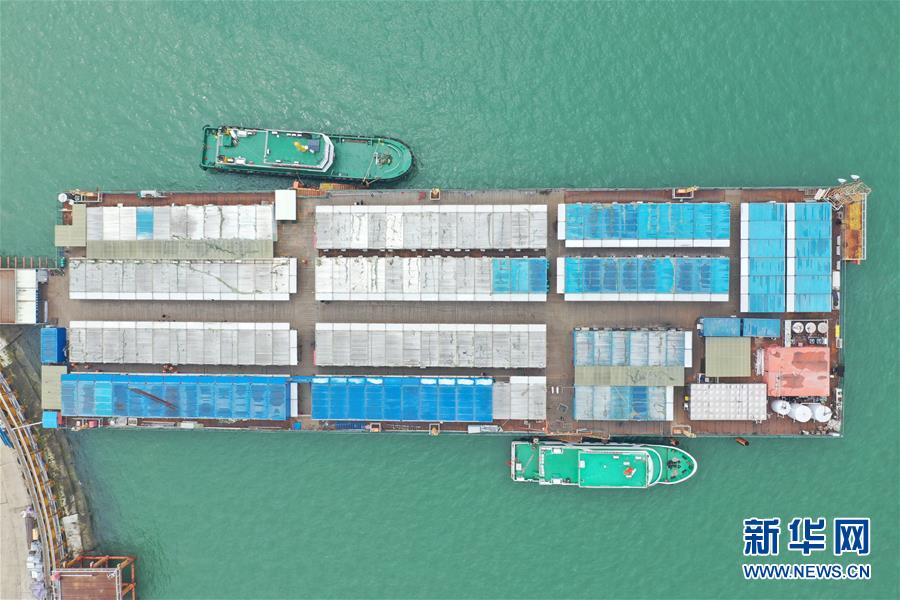 4月25日,幾名工人從海上生活區(qū)前往工地(無(wú)人機(jī)照片)。