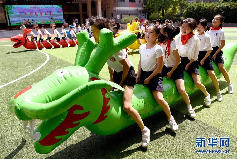 6月24日,西安市新城區(qū)后宰門小學的學生在進行旱地龍舟比賽。端午節(jié)臨近,各地舉行包粽子、做香包、賽龍舟等豐富多彩的民俗文化活動,迎接傳統(tǒng)佳節(jié)的到來。新華社記者劉瀟攝