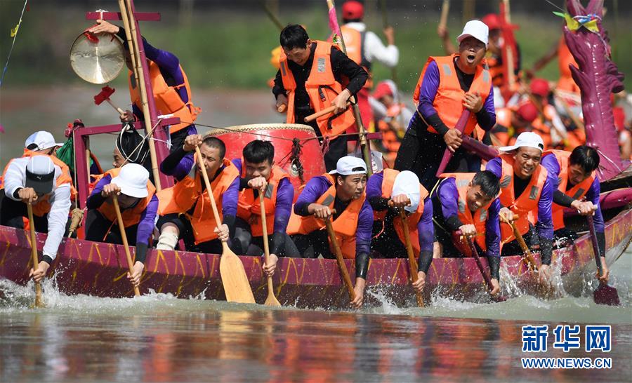 6月25日,參賽龍舟隊在比賽中。當日是農歷五月初五,是中國民間的傳統(tǒng)節(jié)日端午節(jié)。陜西省安康市第20屆龍舟節(jié)在漢江上舉行。每年端陽節(jié)前后,安康沿江一帶的縣區(qū)都舉行龍舟賽,賽龍舟成為民間自發(fā)的盛大活動。新華社記者 陶明 攝