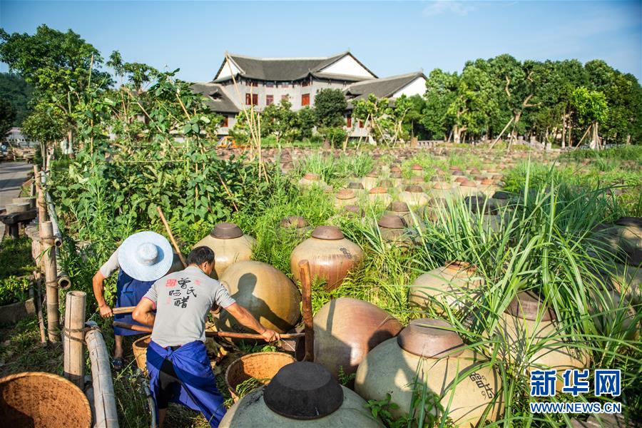 6月26日,工人在曾氏曬醋廠翻取醋醅。新華社記者 陶亮 攝