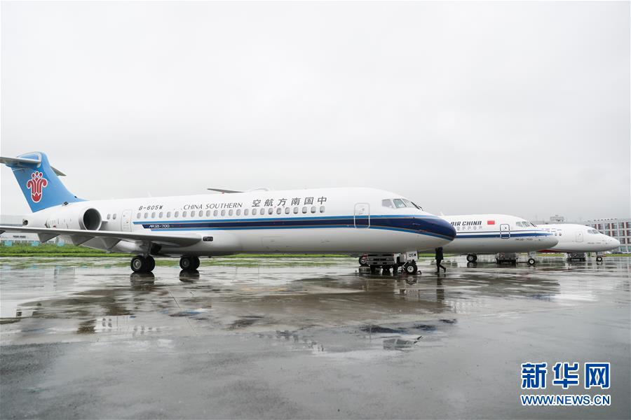 6月28日,嶄新涂裝的國產(chǎn)新支線客機(jī)ARJ21飛機(jī)停放在中國商用飛機(jī)有限責(zé)任公司總裝基地內(nèi)。當(dāng)日,三架嶄新涂裝的國產(chǎn)新支線客機(jī)ARJ21飛機(jī)在位于上海浦東的中國商用飛機(jī)有限責(zé)任公司總裝基地集結(jié),分別交付給國航、東航、南航三大航空公司,標(biāo)志著ARJ21進(jìn)入我國主流民航市場。新華社記者丁汀攝