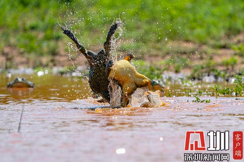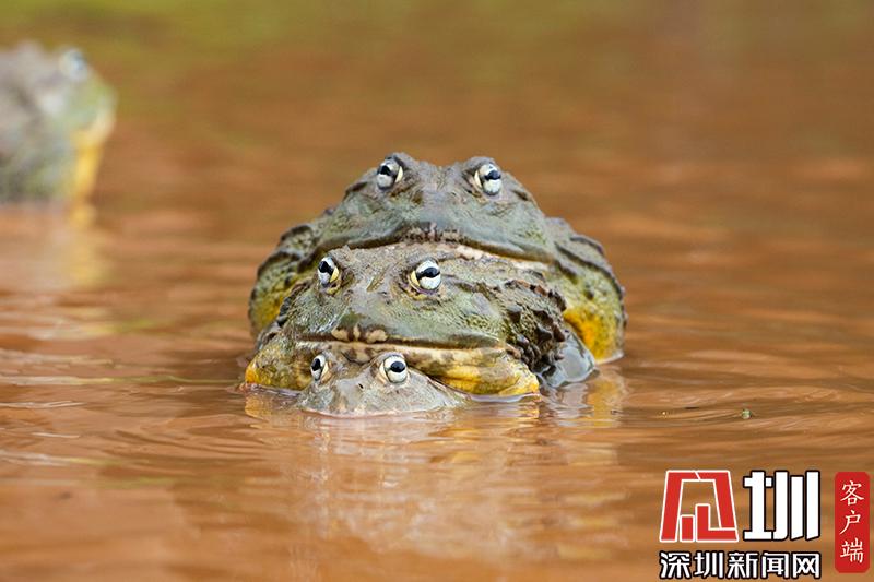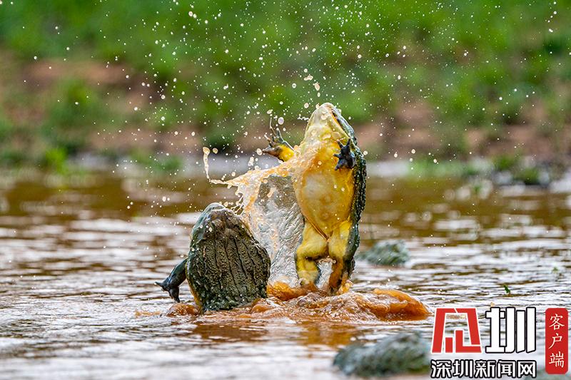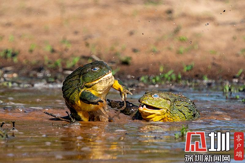2020年6月30日報(bào)道(具體拍攝時間不詳),南非波羅克瓦克,兩只雄性非洲牛蛙為了爭奪雌性牛蛙,在池塘中打架,這樣的情形十分罕見。畫面中,戰(zhàn)況十分激烈,一只非洲牛蛙在另外一只試圖逃到池塘邊緣時撕咬對手,甚至將另外一只拋向空中。這些精彩的照片是由南非開普敦?cái)z影師Temujin Johnson拍攝的。
