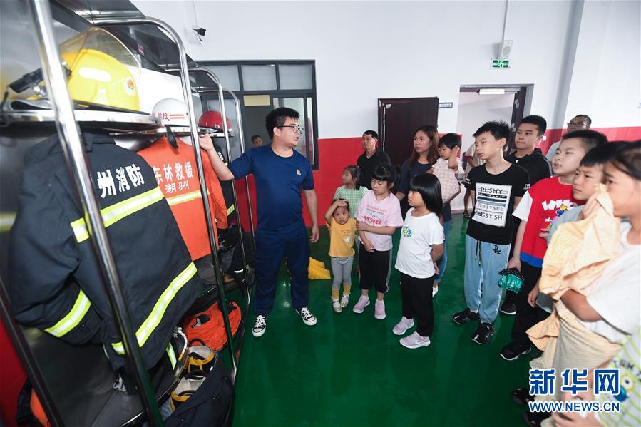 7月16日,東林鎮(zhèn)消防綜合應(yīng)急救援隊(duì)隊(duì)員在給學(xué)生們介紹消防服及消防器材。當(dāng)日,浙江省湖州市吳興區(qū)東林鎮(zhèn)舉辦暑期“安全防護(hù)小超人”主題活動(dòng)?;顒?dòng)由醫(yī)護(hù)人員、消防隊(duì)員等為學(xué)生及家長講授日常安全避險(xiǎn)及溺水急救知識(shí),中小學(xué)們還在現(xiàn)場學(xué)習(xí)了簡易包扎、心肺復(fù)蘇的正確方式,并了解滅火器、滅火毯等消防器材的使用,為學(xué)生平安過暑期打好安全防護(hù)“預(yù)防針”。新華社記者 徐昱 攝