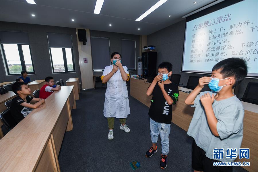 7月16日,小學(xué)生在東林鎮(zhèn)衛(wèi)生院醫(yī)護(hù)人員的示范和講解下學(xué)習(xí)正確佩戴口罩。當(dāng)日,浙江省湖州市吳興區(qū)東林鎮(zhèn)舉辦暑期“安全防護(hù)小超人”主題活動(dòng)?;顒?dòng)由醫(yī)護(hù)人員、消防隊(duì)員等為學(xué)生及家長講授日常安全避險(xiǎn)及溺水急救知識(shí),中小學(xué)們還在現(xiàn)場學(xué)習(xí)了簡易包扎、心肺復(fù)蘇的正確方式,并了解滅火器、滅火毯等消防器材的使用,為學(xué)生平安過暑期打好安全防護(hù)“預(yù)防針”。新華社記者 徐昱 攝