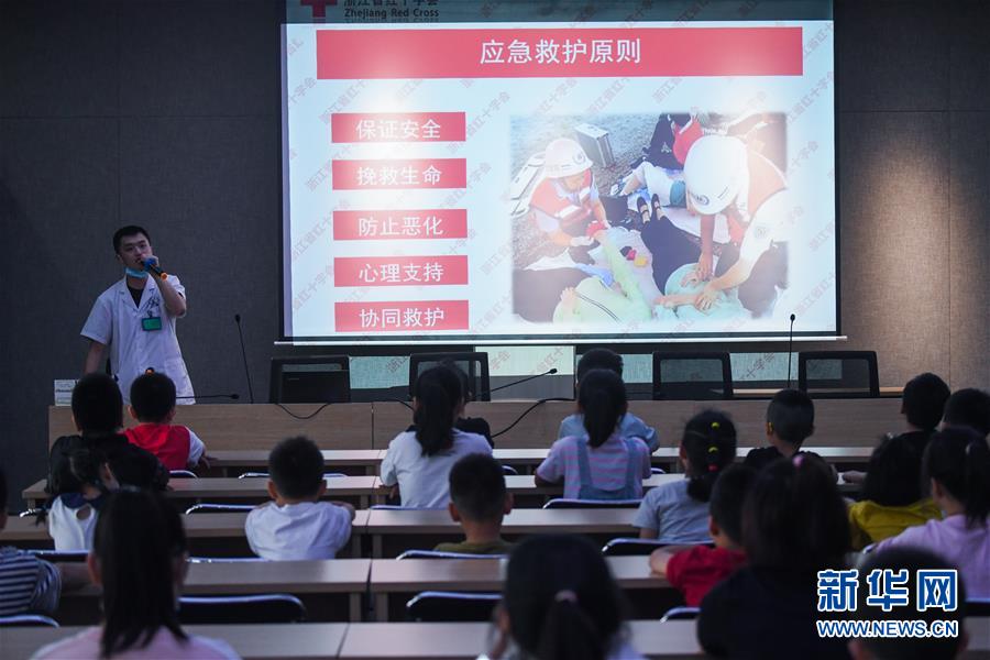 7月16日,東林鎮(zhèn)衛(wèi)生院的醫(yī)護(hù)人員(左一)在給學(xué)生們上應(yīng)急救護(hù)課。當(dāng)日,浙江省湖州市吳興區(qū)東林鎮(zhèn)舉辦暑期“安全防護(hù)小超人”主題活動(dòng)。活動(dòng)由醫(yī)護(hù)人員、消防隊(duì)員等為學(xué)生及家長講授日常安全避險(xiǎn)及溺水急救知識(shí),中小學(xué)們還在現(xiàn)場學(xué)習(xí)了簡易包扎、心肺復(fù)蘇的正確方式,并了解滅火器、滅火毯等消防器材的使用,為學(xué)生平安過暑期打好安全防護(hù)“預(yù)防針”。新華社記者 徐昱 攝