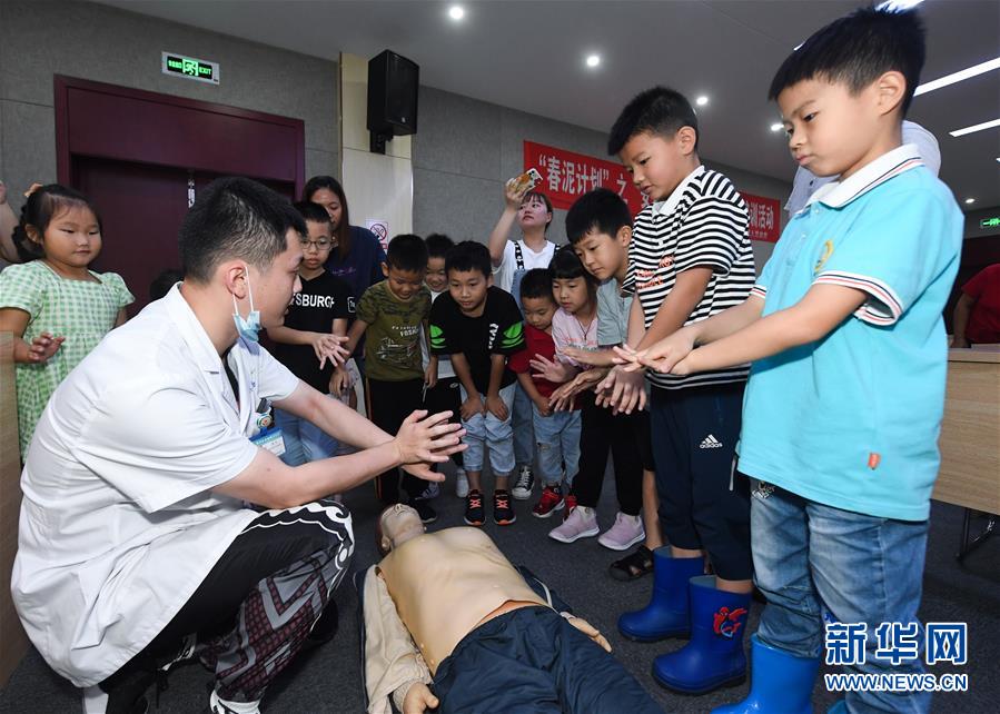 7月16日,學(xué)生們?cè)跂|林鎮(zhèn)衛(wèi)生院醫(yī)護(hù)人員的示范和講解下學(xué)習(xí)正確洗手的方法。當(dāng)日,浙江省湖州市吳興區(qū)東林鎮(zhèn)舉辦暑期“安全防護(hù)小超人”主題活動(dòng)?;顒?dòng)由醫(yī)護(hù)人員、消防隊(duì)員等為學(xué)生及家長講授日常安全避險(xiǎn)及溺水急救知識(shí),中小學(xué)們還在現(xiàn)場學(xué)習(xí)了簡易包扎、心肺復(fù)蘇的正確方式,并了解滅火器、滅火毯等消防器材的使用,為學(xué)生平安過暑期打好安全防護(hù)“預(yù)防針”。新華社記者 徐昱 攝