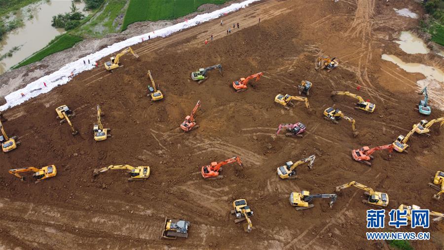 7月28日,在姜唐湖蓄洪區(qū)戴家湖一處涵閘險(xiǎn)情處置現(xiàn)場(chǎng),人們操作機(jī)械設(shè)備在搶筑臨時(shí)圩堤(無人機(jī)照片)。新華社記者張端攝