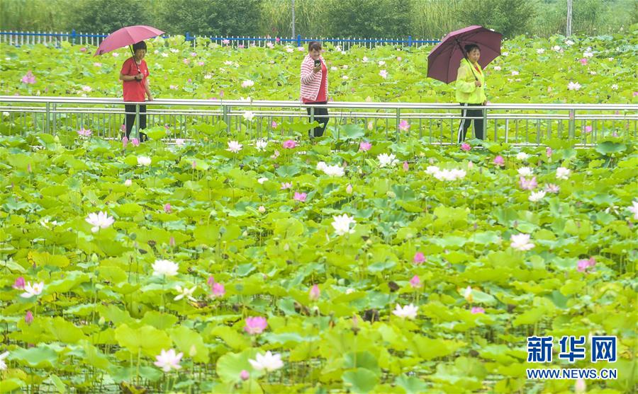 8月6日,游客在河北省永清縣里瀾城鎮(zhèn)金華湖觀賞荷花。夏日時節(jié),河北省永清縣里瀾城鎮(zhèn)金華湖荷塘的荷花爭相開放,吸引市民和游客前來游玩觀賞。新華社記者李曉果攝