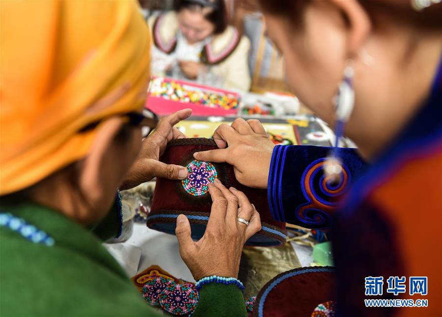 在內(nèi)蒙古自治區(qū)鄂溫克族自治旗巴彥托海鎮(zhèn)太陽花傳承發(fā)展中心,脫貧戶敖登圖雅(左)向?yàn)跞式桓蹲约褐谱骱玫氖止に嚻罚?月6日攝)。新華社記者徐欽攝。