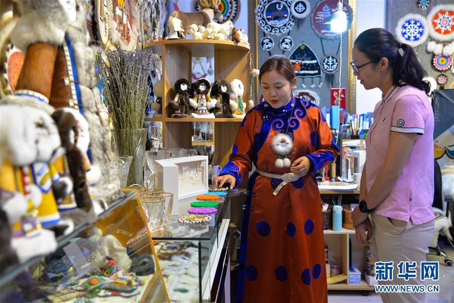 艾吉瑪(左)在內(nèi)蒙古自治區(qū)鄂溫克族自治旗巴彥托海鎮(zhèn)太陽花傳承發(fā)展中心向顧客介紹手工藝品(8月6日攝)。新華社記者徐欽攝。