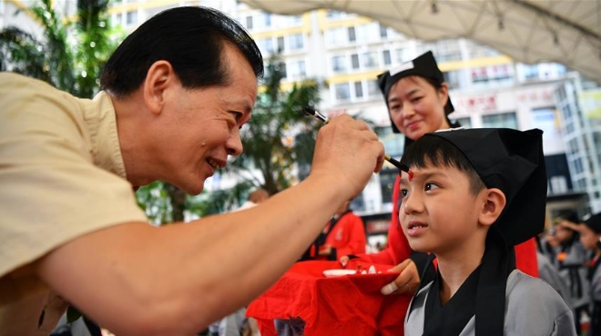 海口胡畫少兒藝術(shù)中心為500名小朋友舉行“開筆禮”,通過“點朱砂,啟智慧”“習書法,描人字”等儀式讓孩子們體驗中國傳統(tǒng)文化。