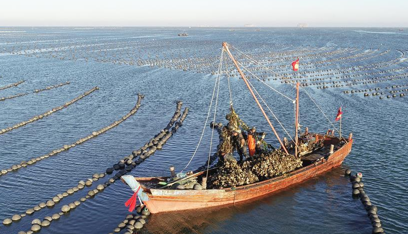 當(dāng)日,在遼寧省大連市長(zhǎng)海縣廣鹿島海域,漁民忙碌地打撈牡蠣,呈現(xiàn)一片繁忙的豐收景象。