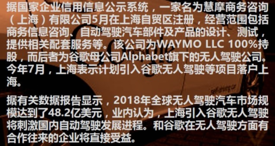 谷歌母公司Alphabet旗下研究自動(dòng)駕駛的部門Waymo在自動(dòng)駕駛領(lǐng)域處于全球領(lǐng)先水平,當(dāng)前其已經(jīng)完成800萬英里(約1287萬公里)自動(dòng)駕駛汽車公共道路測(cè)試,模擬測(cè)試?yán)锍踢_(dá)到50億英里(約80.47億公里)。Waymo計(jì)劃在為今年下半年向部分地區(qū)的美國消費(fèi)者推出無人駕駛服務(wù)。