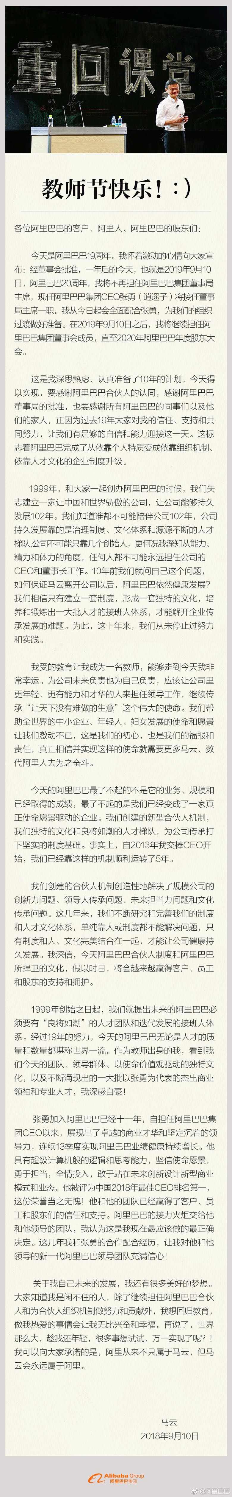 智通財經(jīng)APP獲悉,阿里巴巴官方微博和微信公眾號均發(fā)布了一封馬云的公開信,信中表示,一年后的阿里巴巴20周年之際,即2019年9月10日,他將不再擔任集團董事局主席,屆時由現(xiàn)任集團CEO張勇接任。